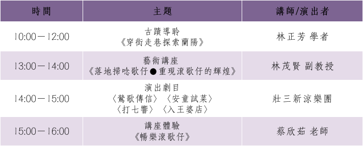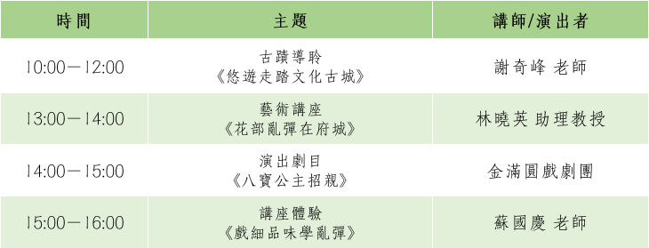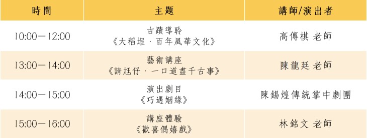 延續文資局「戲苑‧遊藝」推廣傳統表演藝術文化資產的計畫精神,本次結合「古蹟導聆」、「藝術講座」、「演出」、「講座體驗」等四大主題,邀請民眾透過專業文史工作者的講述、藝師及傳統藝術表演團隊的演出、講師帶領的體驗學習課程,一起進入時光隧道,重新感受傳統藝術積累發揚的軌跡與古蹟深刻的歷史紋理。