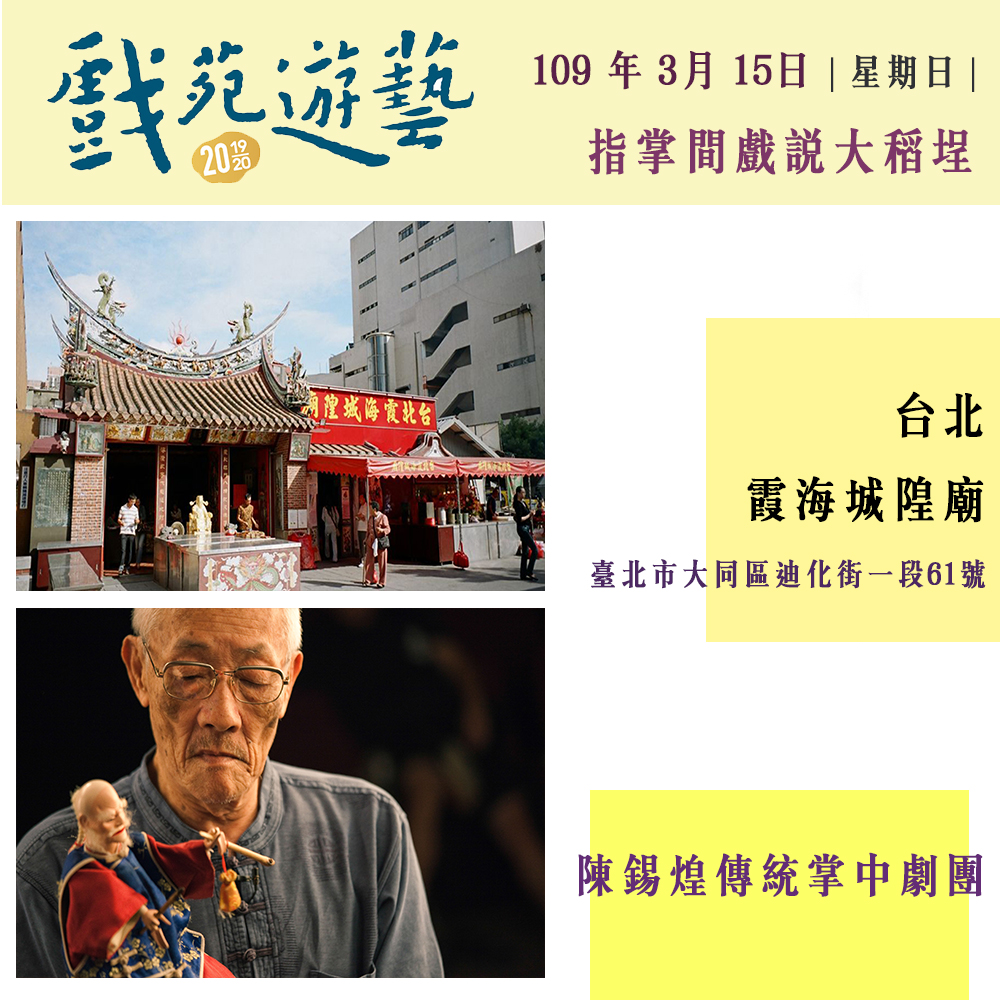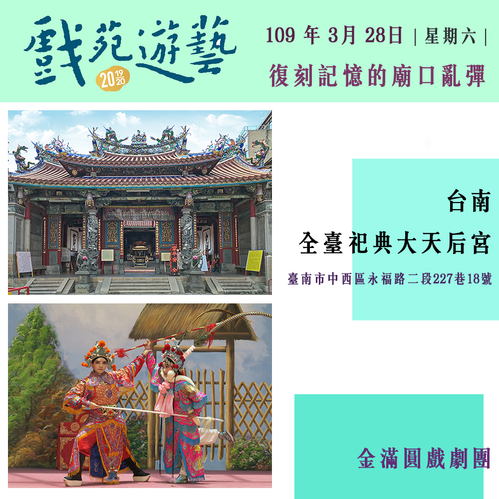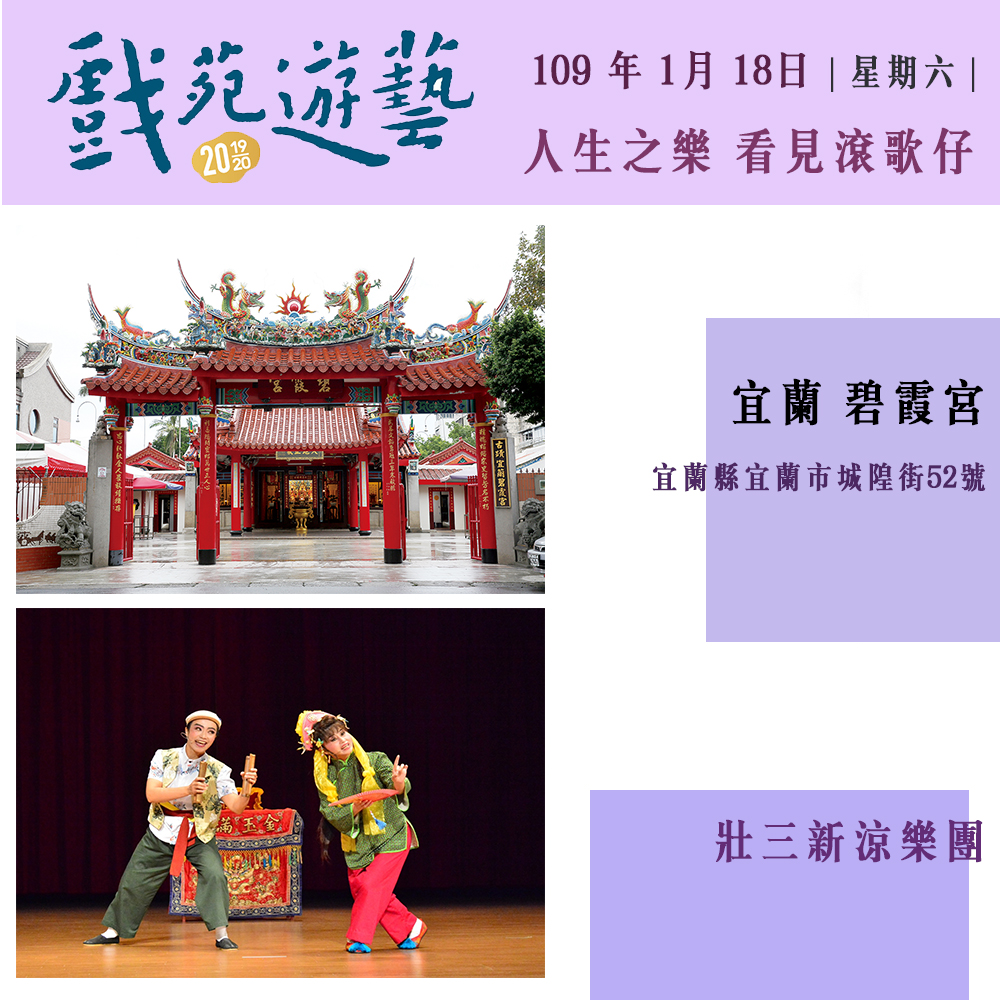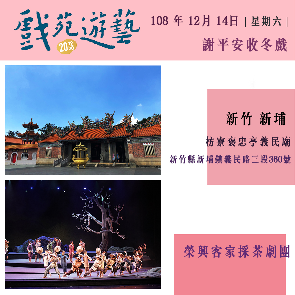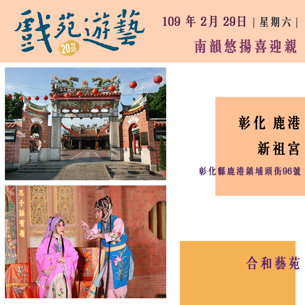 回顧去年(2018)「戲苑‧遊藝—打開古藝大宅門 遇見國寶看戲趣」邀請重要傳統表演藝術、國寶藝師、傳習藝生,於國定古蹟建築中展演,深獲各界好評。今年和明年更將活動擴大辦理,為深入文化的根基,將活動足跡擴及北、中、南、東等地區,匯聚地方特色及當地文化記憶,展現臺灣美好的多元文化使之成為綜合有機體。自今年十二月起至明年的三月份將陸續在新竹褒忠亭義民廟、屏東老七佳石板屋聚落、宜蘭碧霞宮、彰化鹿港新祖宮、台北霞海城隍廟、台南全臺祀典大天后宮等場地,接力推出六場精彩演出。