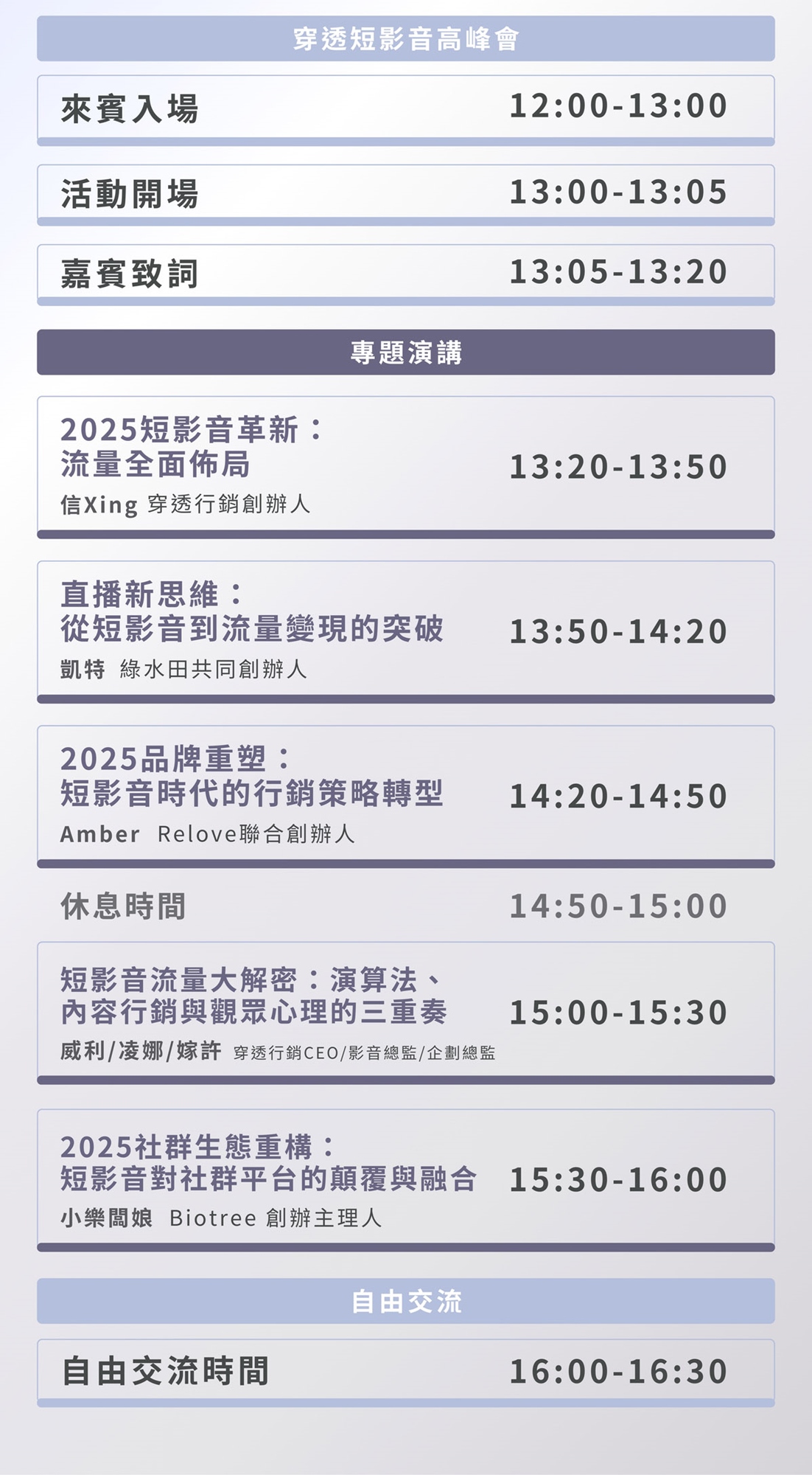 透過各領域精英和領袖演講,我們將帶您共同挖掘創新思路,尋求新時代下的短影音行銷變革!