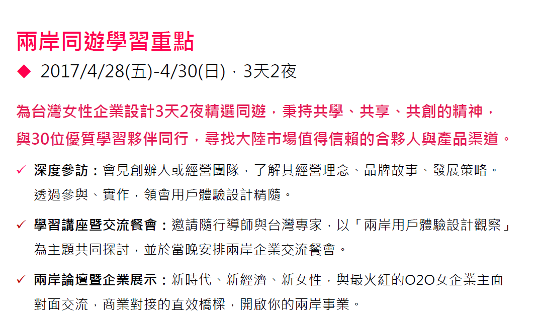 為台灣女性企業設計3天2夜精選同遊,秉持共學、共享、共創的精神,